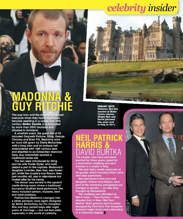 Heres a snippet of the article inside. Pop queen madonna and her husband guy ritchie are to spend their first wedding anniversary at the scottish castle where they tied the knot it was reported today. Madonna is to marry the british film director guy ritchie three days before christmas in a remote part of the scottish highlands in what is likely to be the entertainment worlds biggest circus for.