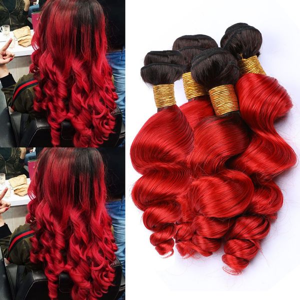 2019 Ombre Bright Red Dark Roots Loose Wave Peruvian Virgin Hair Weave Bundles 1b Red Ombre Wavy Human Hair Wefts Mixed Length From China Hair02