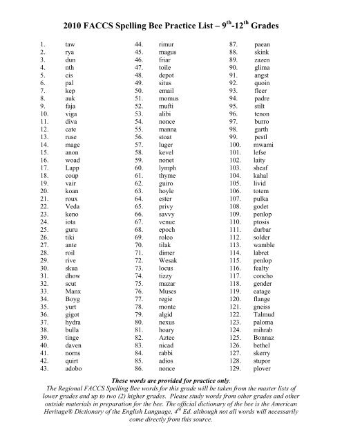 2010 Faccs Spelling Bee Practice List 9 12 Grades