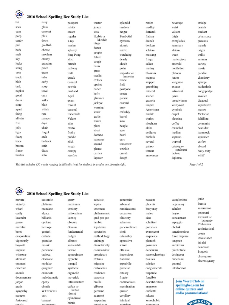 010 2016 School Spelling Bee List 2 Pager