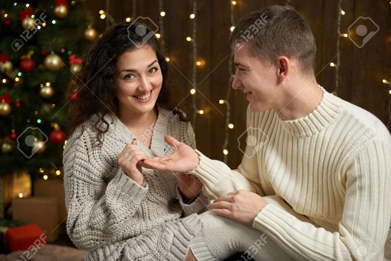 The Man Gives The Girl An Engagement Ring Couple In Christmas