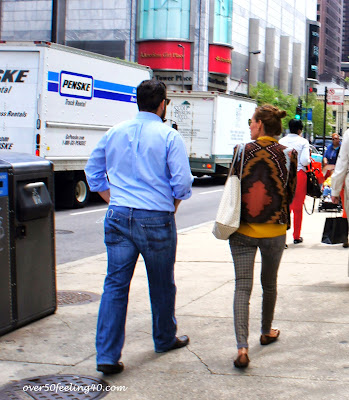 I literally stalked this woman below...chasing her down Michigan Ave. If you look closely at her attire, it is exactly what I described in this post, HERE. She is wearing the leaf on top and the granite leggings on the bottom. WOW...great minds think alike...I still think it would look good in a tunic top!